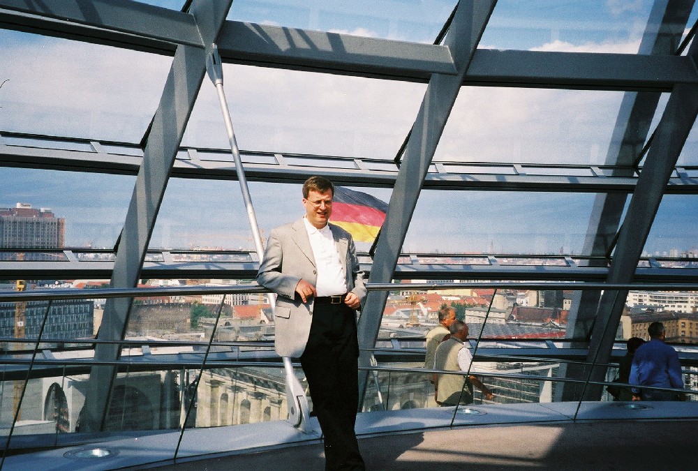 Stephan enjoying tea at Adlon Kempinski and the skylight in the central atrium.