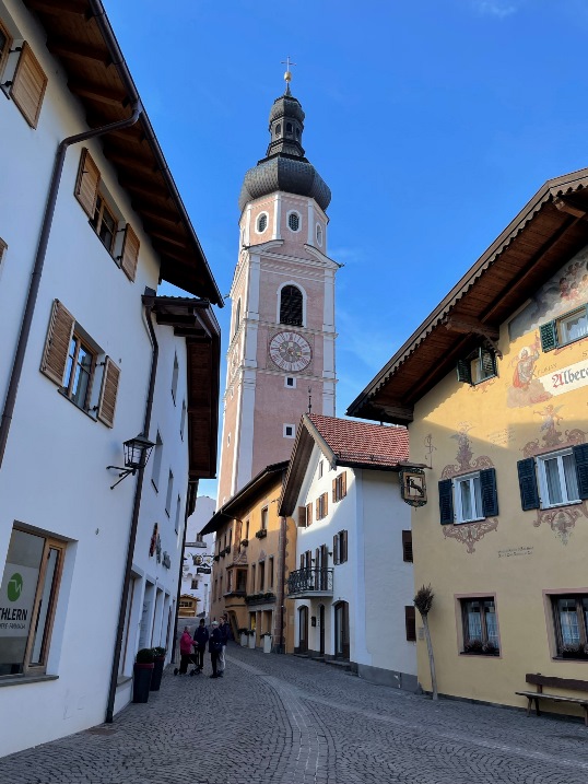 A day off from skiing in Stubaital we drove to Südtirol/Alto Adige and visited this scenic little town with a parish church - Sts Peter & Paul. The church has an 88 m. high steeple. Another special feature of the steeple is that it is separated from the church.
