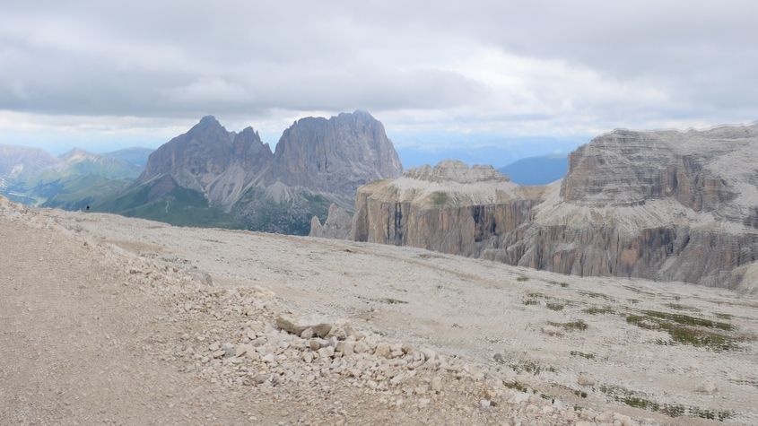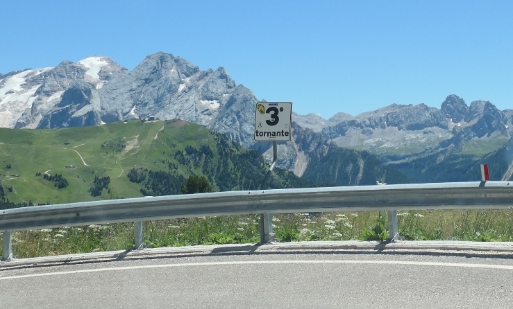 Marmolada, the highest peak of the Dolomites and the only one with a failrly sized glacier which sadly is melting away... And down in the valley the east ramp of the Pordoipass road.