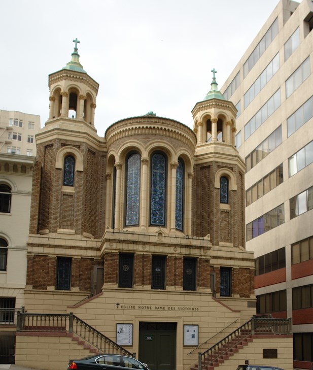 Église Notre Dame des Victoires near Union Square on Bush Street [below, left] & The Goddess of Victory statue atop the Dewey Monument on Union Square [below, right]