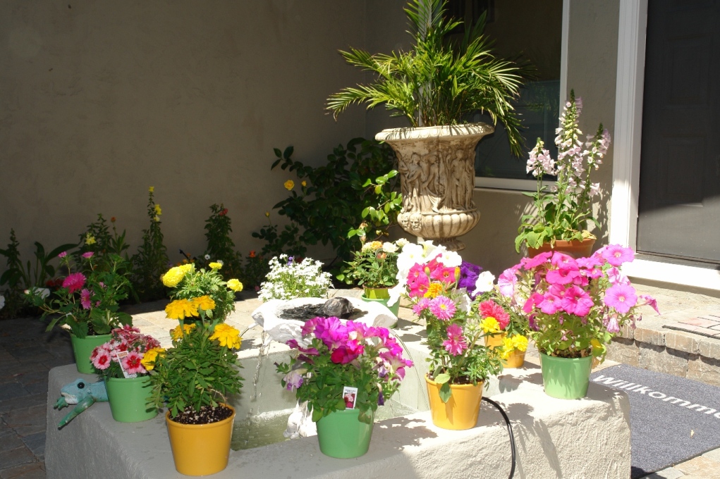 Our courtyard with the fountain and flowers. The rocks on top of the fountain came all the way from Armenia [left below]